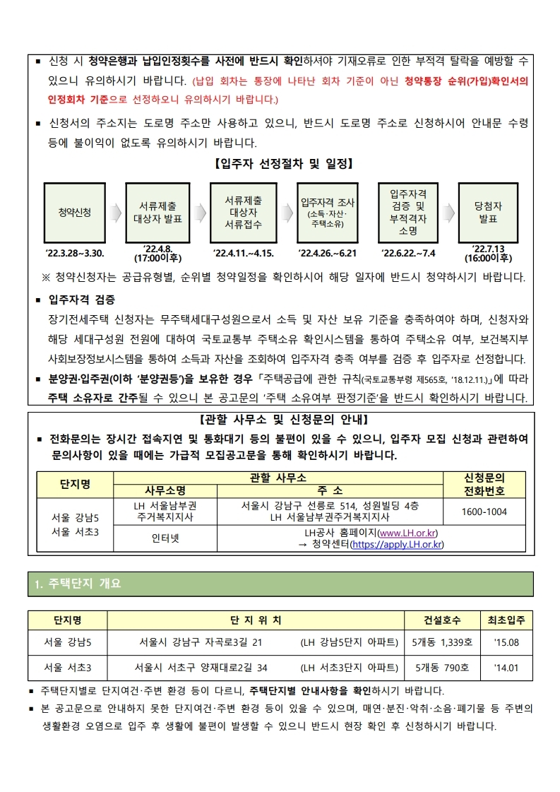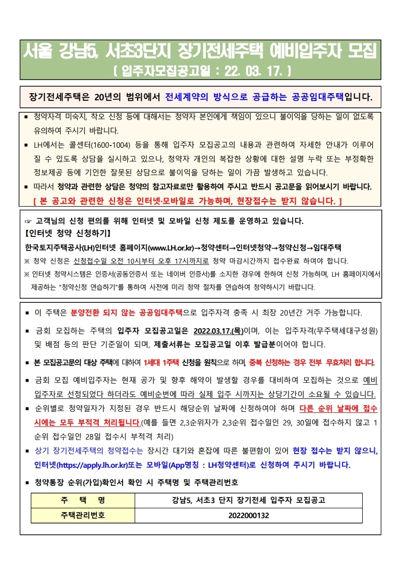 서울 강남5, 서초3단지 장기전세임대주택 예비입주자 모집 공고문입니다.